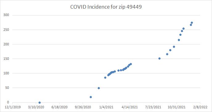 Following are the data for 49449, the Pentwater zip code. Among other things, they raise the question of how cases are assigned geographically.