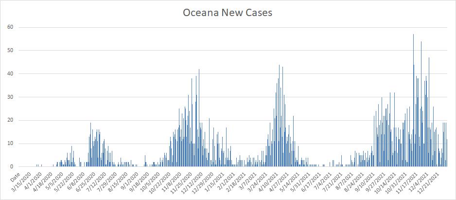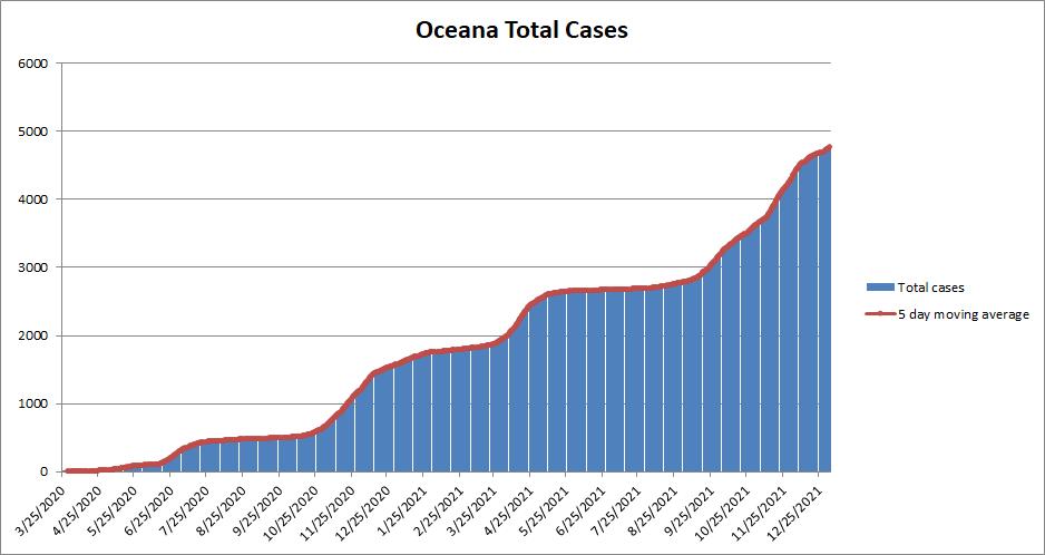 "Oceana County is at an extremely high risk level for Covid-19 infections. The average number of new cases in Oceana County fell to 11 yesterday, a 9 percent decrease from the day before. Since January of last year, at least 1 in 13 people who live in Oceana County have been infected, and at least 1 in 519 have died."
