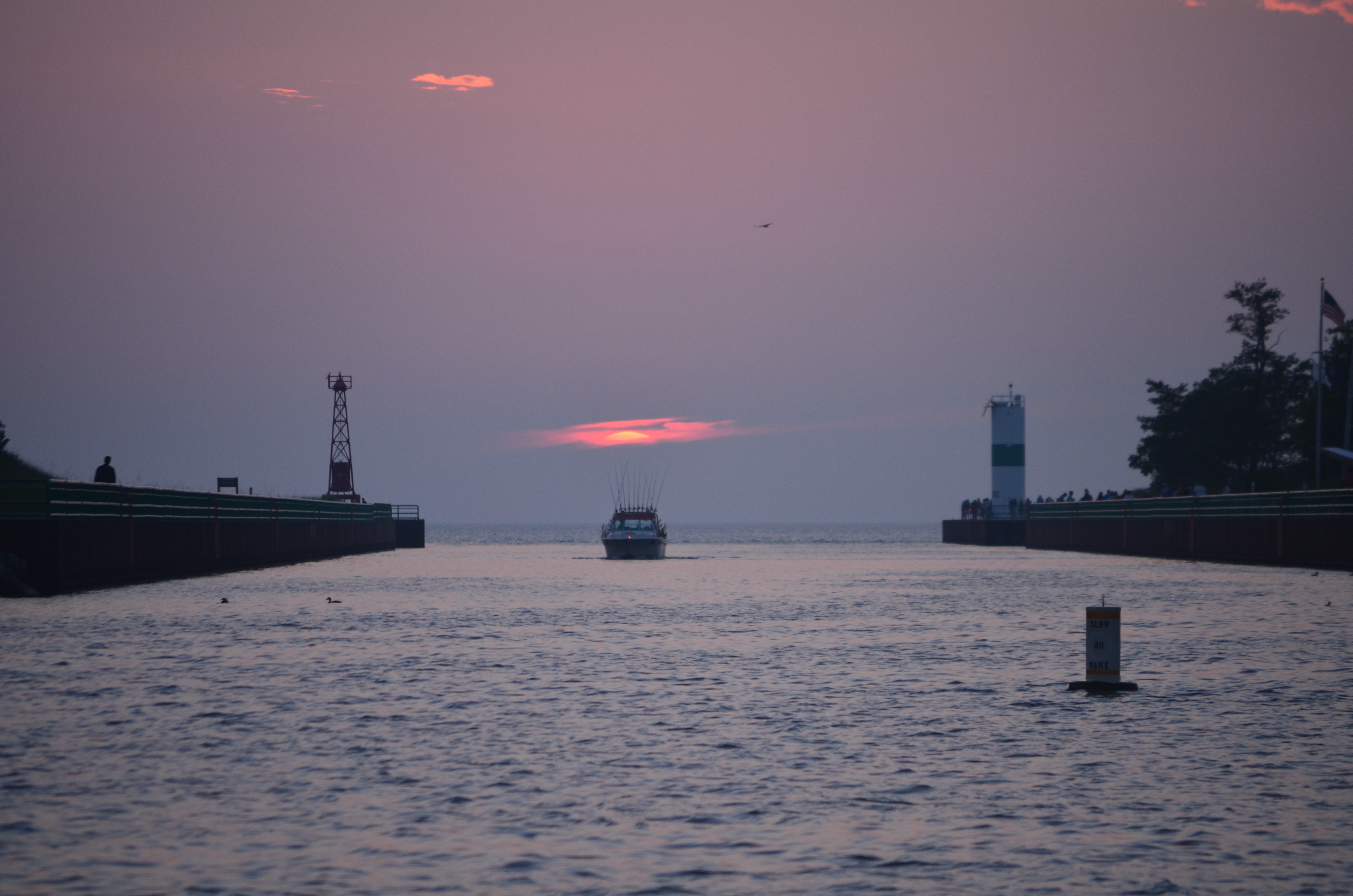 In 2002 the Pentwater Yacht Club began celebrating the evenings when the sun sets down the center of the channel. This, of course, happens twice a year, in May and August. The date is predicted by using 293.6 as the true bearing of the channel, and by using the US Naval Observatory data for altitude and azimuth. The chosen date is the one when the altitude of the sun approaches 0 and the azimuth is closest to 293.6.